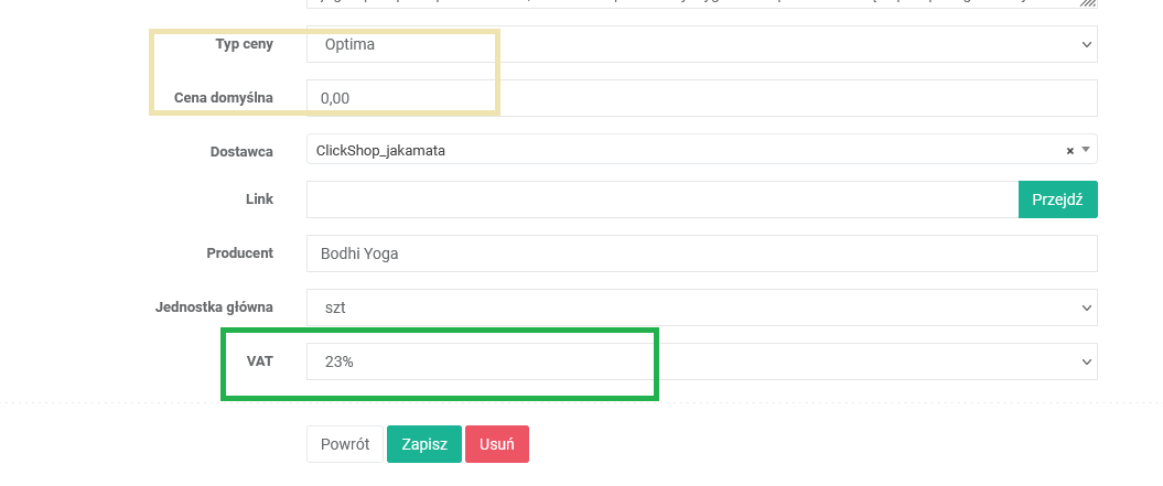 Pole cena zaznaczona na żółto nie bierze udziału w integracjach z kanałami sprzedaży