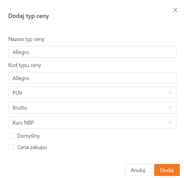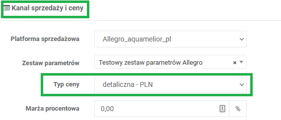 • Typ ceny – może pozostać pusta. Cena domyślna która będzie się podpowiadać podczas wystawienia ofert. Jednak na dalszym kroku wystawiania oferty, po wskazaniu kanału sprzedaży typ ceny ustawia się zgodnie z typem ceny wskazanym na konkretnej integracji (np. z integracji z Allegro)