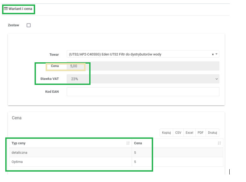 Rodzaj ceny (netto/brutto) jest zgodny z ustawieniem ceny (Konfiguracja /-> Ceny /-> Typy cen)