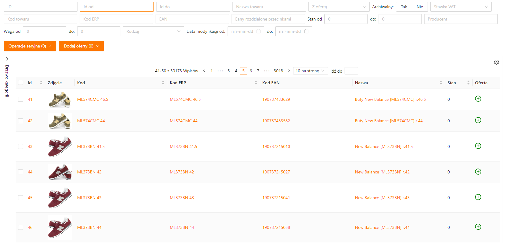 Po lewej stronie tabeli z towarami znajduje się rozwijana zakładka – Drzewo kategorii. Wybranie kategorii w tym miejscu umożliwia filtrowanie listy do towarów zawierających tę kategorię.