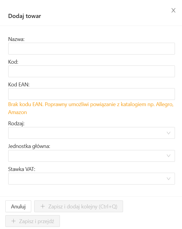 Jeśli chcesz dodać nowy towar, kliknij przycisk +Dodaj i uzupełnij wymagane pola w formularzu dodawania towaru. Następnie kliknij przycisk Zapisz i przejdź, aby przejść do widoku nowo utworzonego towaru, lub Zapisz i dodaj kolejny (lub użyj skrótu Ctrl + Q), aby dodać kolejny towar. Pamiętaj o ustawieniu cennika i ceny oraz wybraniu magazynu i dodaniu stanu magazynowego.