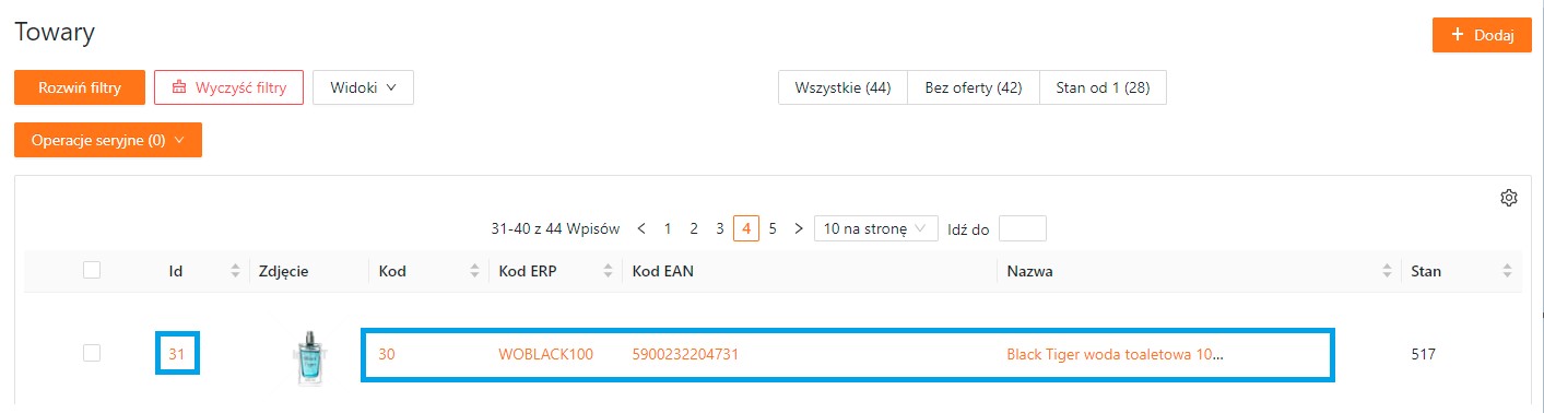Kolumny zawierające dane o towarze są jednocześnie odnośnikami. Po kliknięciu na id, kod lub nazwę zostaniesz przekierowany do widoku towaru (szerszy opis edycji towaru znajduje się w tym poradniku).