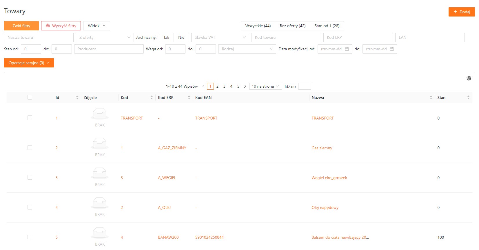 Dzięki dostępności kilkunastu filtrów w nagłówku widoku możesz wygodnie przeglądać towary. Przycisk Zwiń filtry służy do ukrycia pól filtrowania (wybrane filtry nadal działają), natomiast Wyczyść filtry resetuje ustawienia wszystkich wybranych filtrów. Poniżej znajdziesz krótki opis każdego z filtrów.