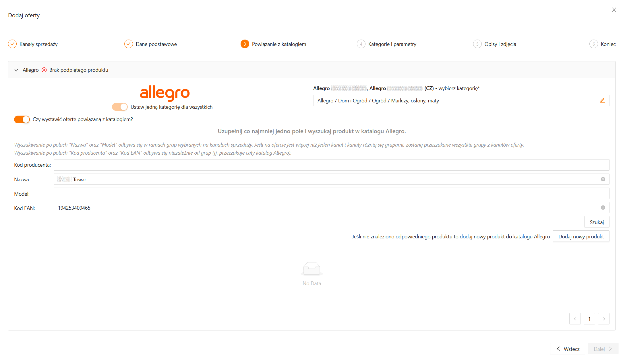 Można zdecydować czy wystawiana oferta ma zostać połączona z katalogiem Allegro. Po wyszukaniu w katalogu pojawią się produkty z katalogu pasujące do wskazanego kodu. To zagadnienie zostało szczegółowo opisane we wpisie Produktyzacja Allegro.