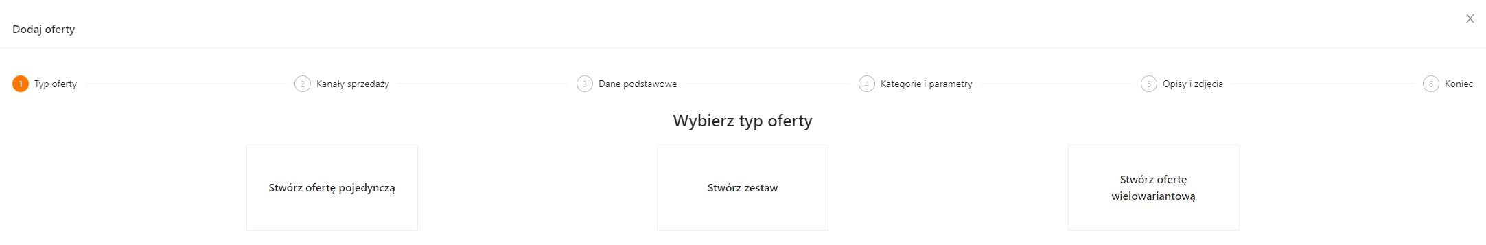 W tym miejscu należy wskazać jaka oferta ma zostać utworzona. Po wybraniu jednej z opcji zostanie automatycznie otwarty następny krok w kreatorze. Ilość kroków zależna jest od wybranej opcji.