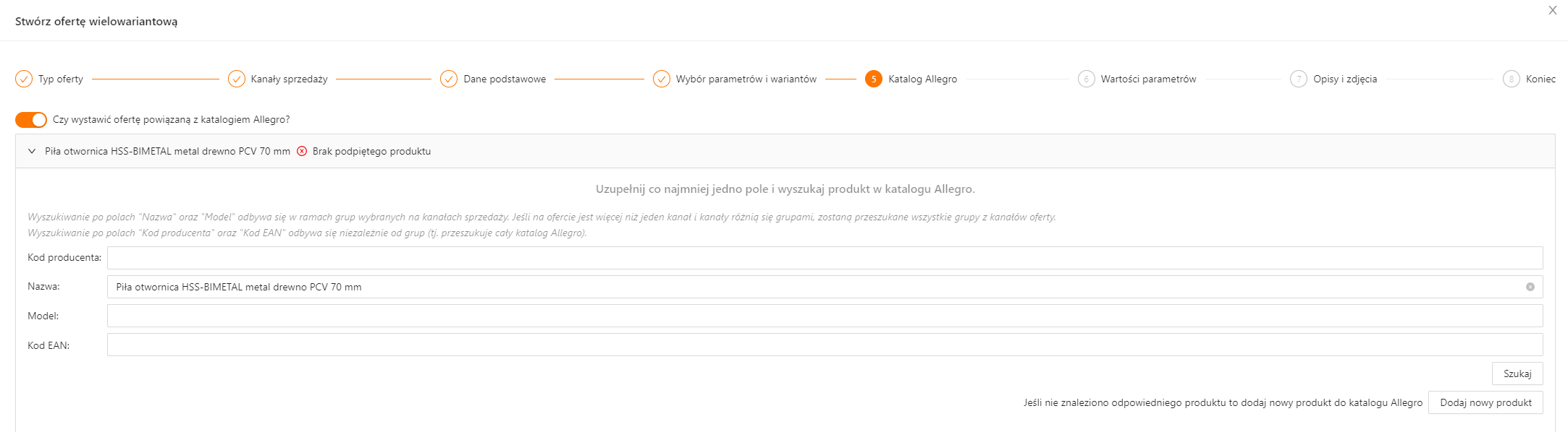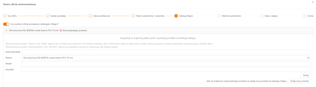 Można zdecydować czy wystawiana oferta ma zostać połączona z katalogiem Allegro. W niektórych kategoriach Allegro do wystawienia oferty jest wymagane połączenie z katalogiem.