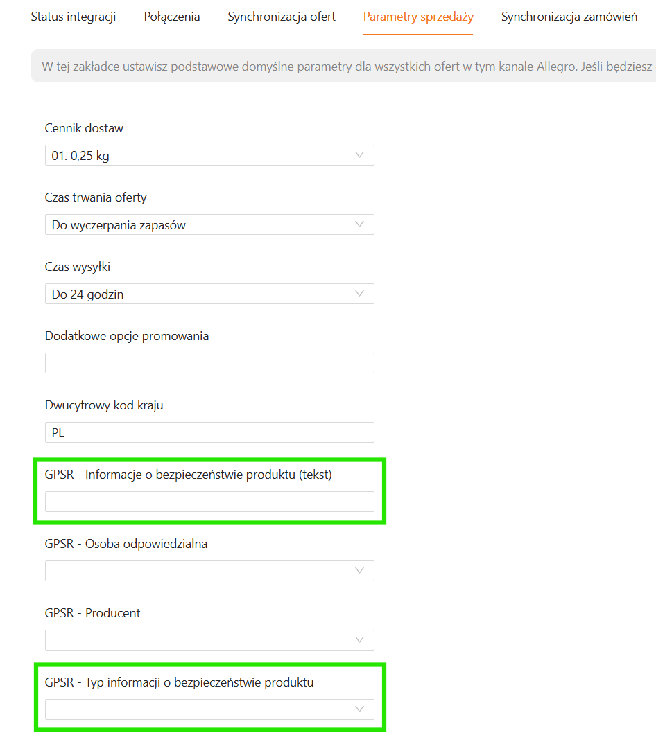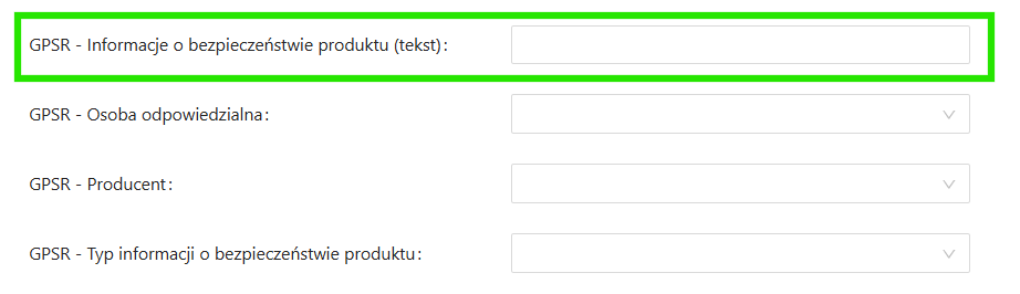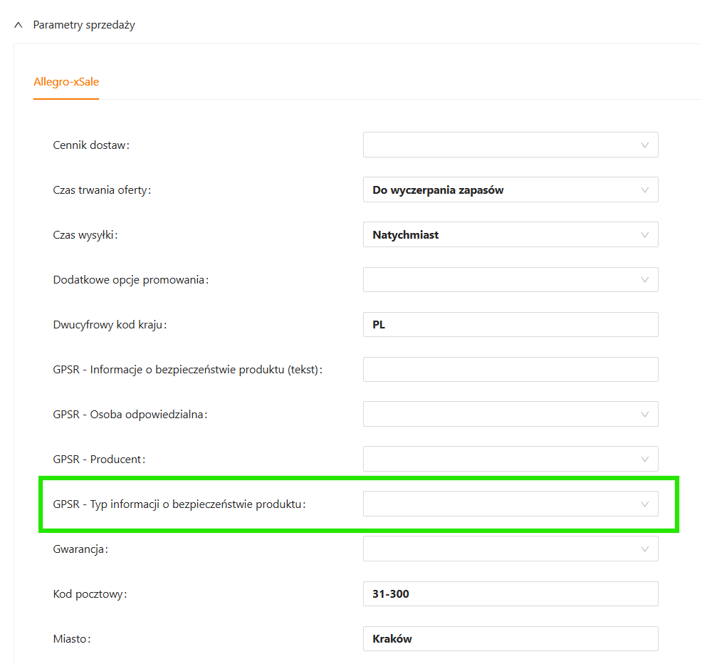 W Parametrach sprzedaży w polu GPSR -Typ informacji o bezpieczeństwie wybierz z listy Brak informacji o bezpieczeństwie.