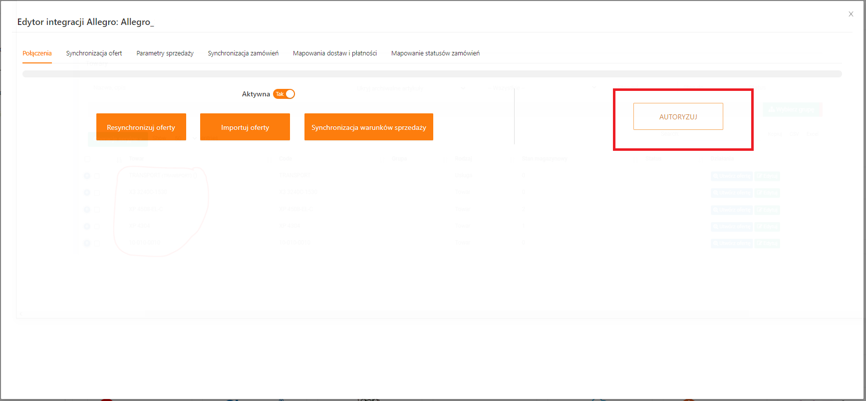 Jeżeli token stracił ważność należy przejść autoryzację klikając przycisk AUTORYZUJ i logując się do konta Allegro.