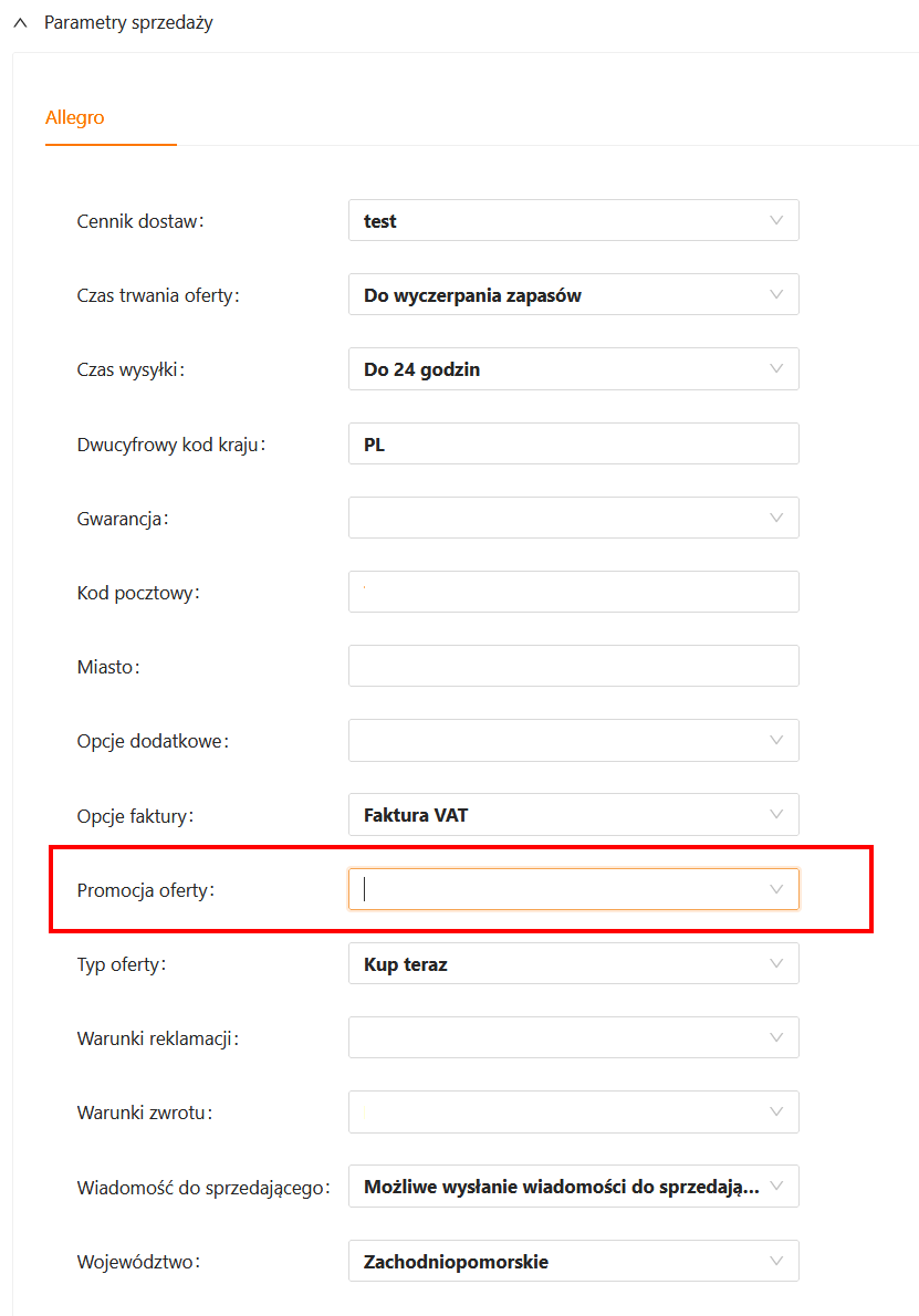 Parametr odpowiedzialny za ustawienie opcji promowania aukcji na Allegro, to Promocja oferty i może być uzupełniony w sekcji Parametry sprzedaży podobnie jak inne dane sprzedaży.