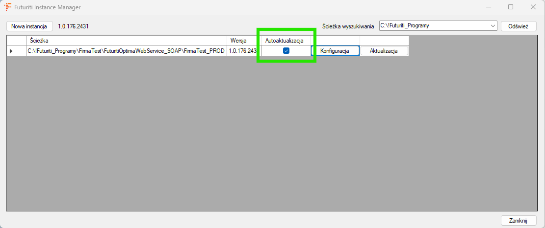 Po poprawnym zapisaniu ustawień w oknie Instance Managera zobaczysz zaznaczoną kolumnę Autoaktualizacja.
