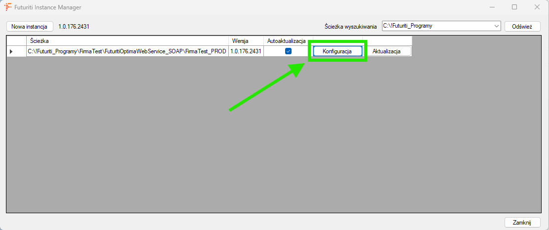 - Kliknij przycisk Konfiguracja przy ścieżce z lokalizacją Futuriti WebService.
