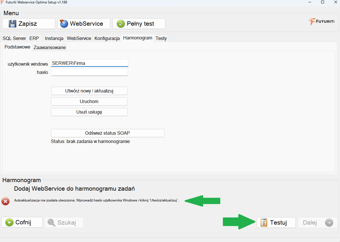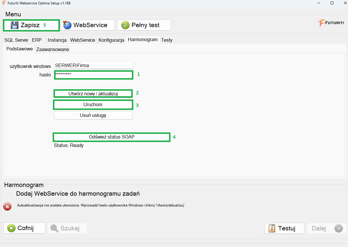 - Jeżeli konfigurator wymaga ponownego utworzenia zadania, wpisz hasło użytkownika Windows, kliknij Utwórz nowy / aktualizuj, uruchom usługę, odśwież status SOAP i zapisz zmiany.
