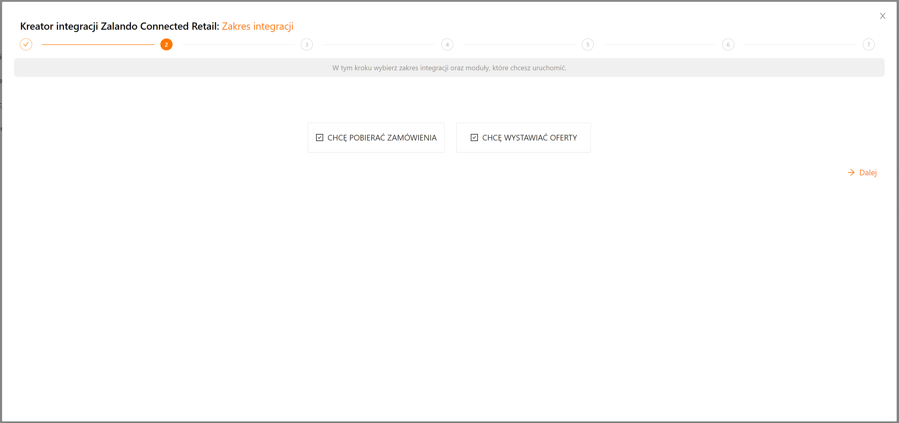 Należy określić zakres integracji, czyli czy chcemy pobierać zamówienia, czy wystawiać oferty. Domyślnie obie opcją są zaznaczone.