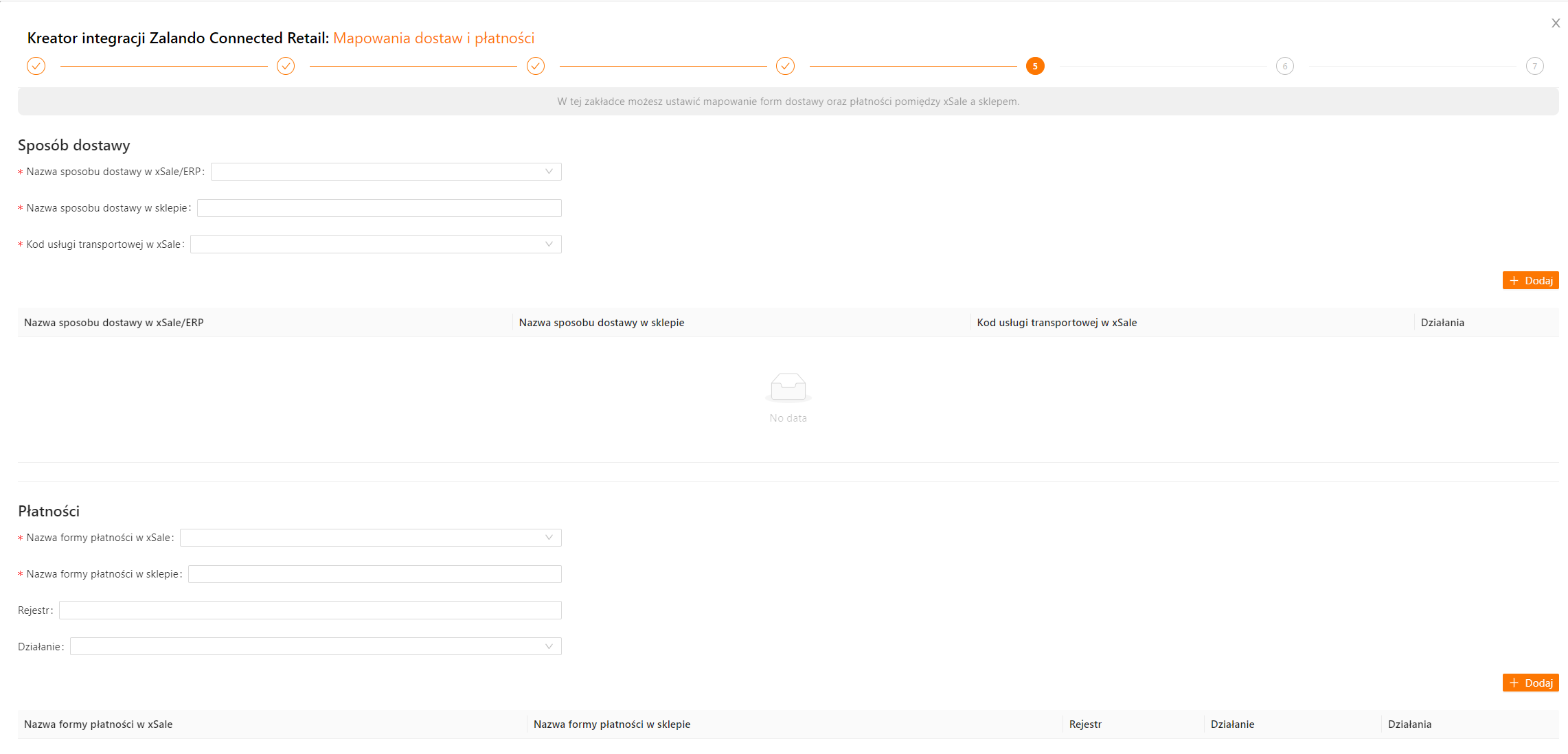 W tym kroku ustalamy na jakie typy płatności i formy dostawy wczytywać zamówienia.  Konfiguracja mapowań dostaw i płatności została szczegółowo opisana w osobnych artykułach. Jeżeli wszystkich zamówieniach z Zalando przewidujemy jeden typ płatności i jeden sposób dostawy, to w polach Nazwa sposobu dostawy w sklepie i Nazwa formy płatności w sklepie wpisujemy *.