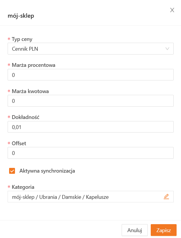 Możesz ustawić typ ceny, marżę, offset i zaktualizować kategorię, ale pamiętaj, że aktualizację tych danych po stronie sklepu musi obsłużyć Twoja integracja.