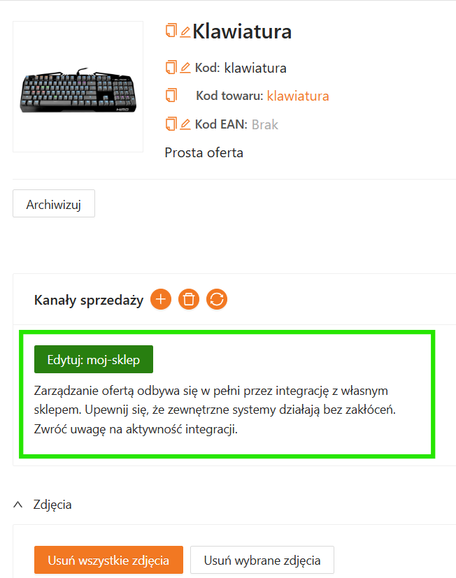 W integracji z własnym sklepem nie ma przycisku Zakończ sprzedaż, dlatego status oferty kontrolujesz przede wszystkim przez aktywność kanału i logikę zaimplementowaną po stronie własnej integracji.