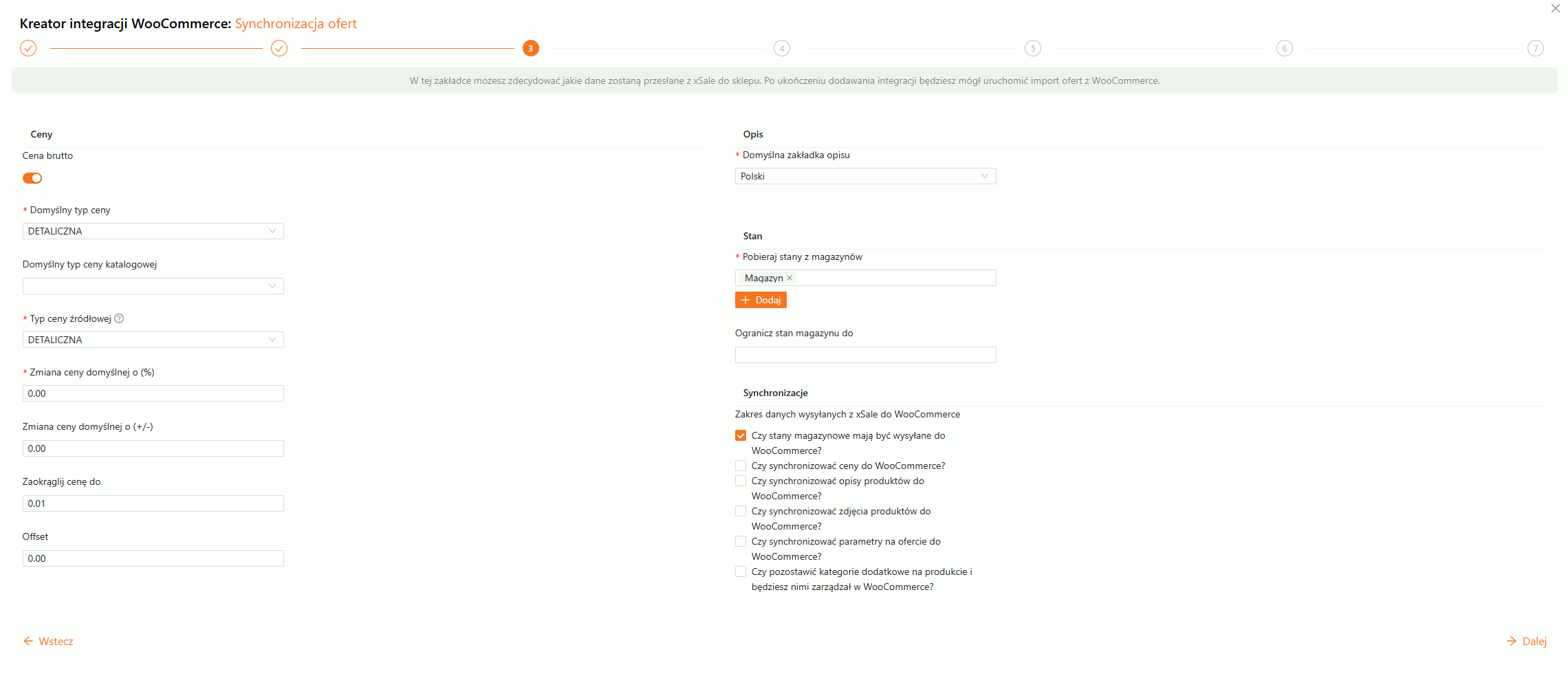 W części Zakres danych wysyłanych z xSale do WooCommerce możesz określić, jakie dane mają być synchronizowane na ofertach. Do wyboru są: