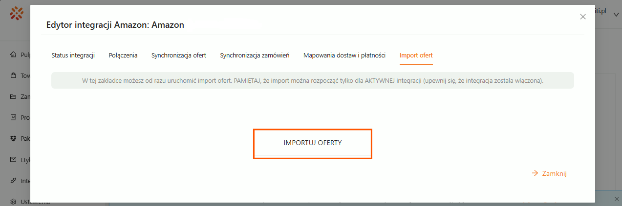 Wejdź do menu Integracje i edytuj integrację z Amazonem, dla której chcesz zaimportować oferty.