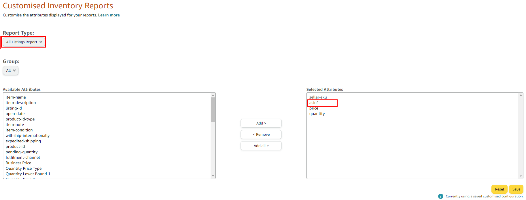 - Wybierz raport All Listings Report i przejdź do modyfikacji jego kolumn.