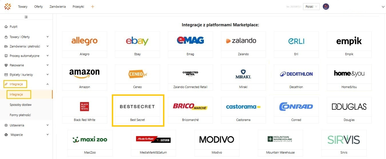 - W sekcji Integracje z platformami Marketplace należy wyszukać tej z logo i nazwą BestSecret