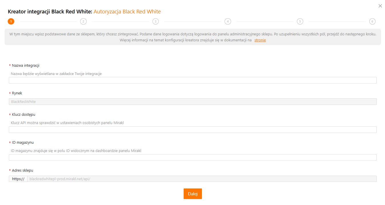 Z uwagi na to, że kreator jest dedykowany do integracji z Black Red White, to pola Rynek i Adres sklepu są już automatycznie uzupełnione.