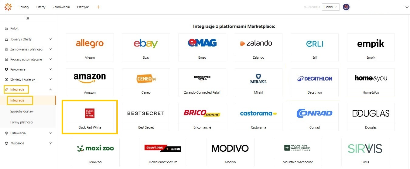 - W sekcji Integracje z platformami Marketplace należy wyszukać tej z logo i nazwą Black Red White