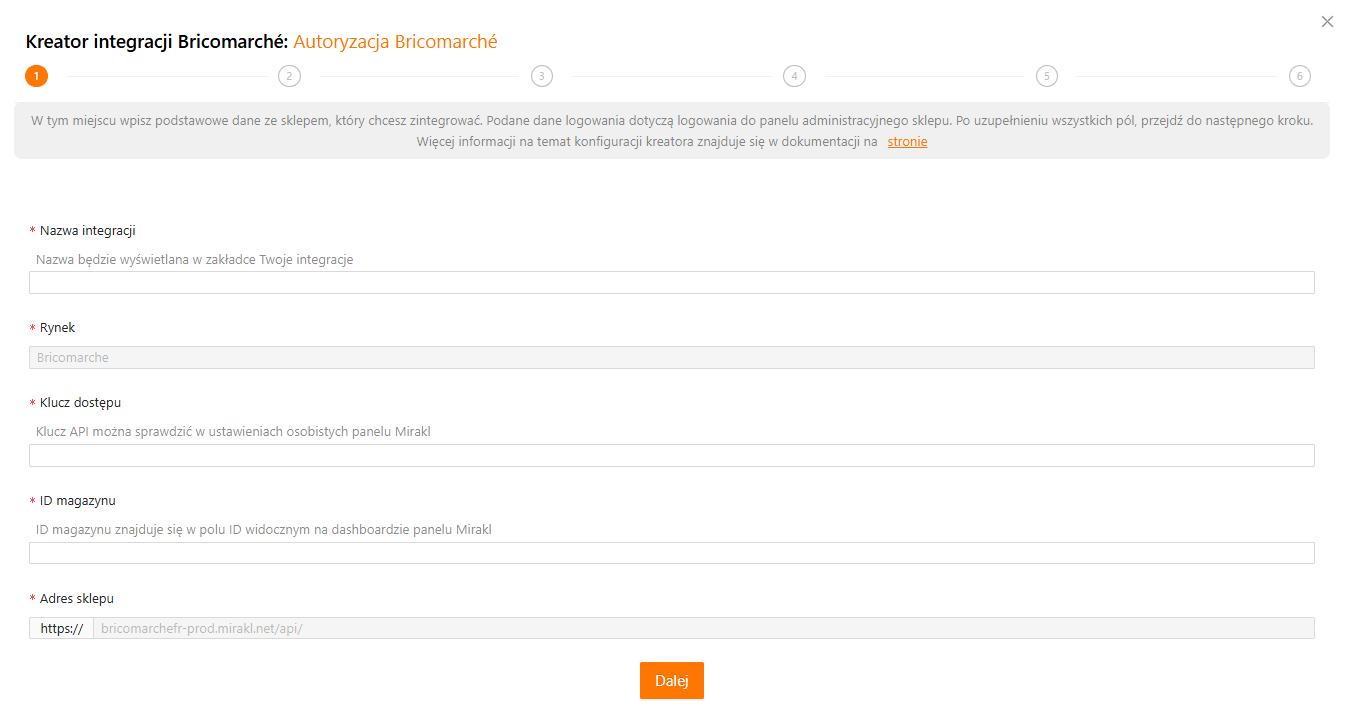 Z uwagi na to, że kreator jest dedykowany do integracji z Bricomarché, to pola Rynek i Adres sklepu są już automatycznie uzupełnione.