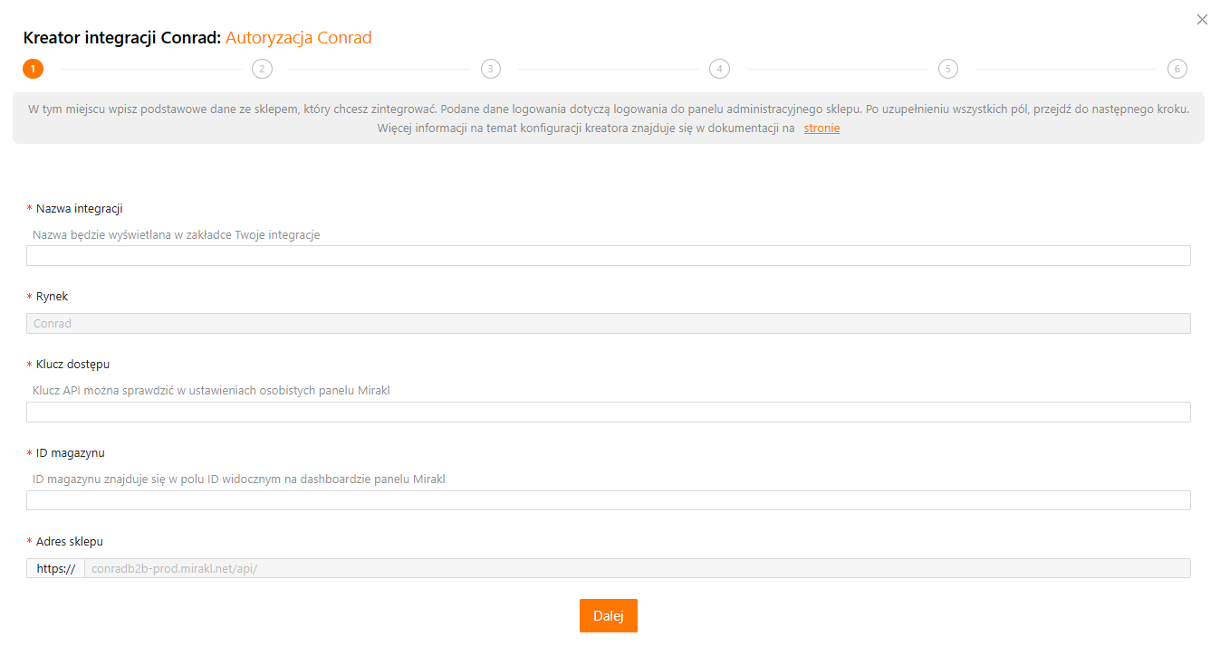 Z uwagi na to, że kreator jest dedykowany do integracji z Conrad, to pola Rynek i Adres sklepu są już automatycznie uzupełnione.