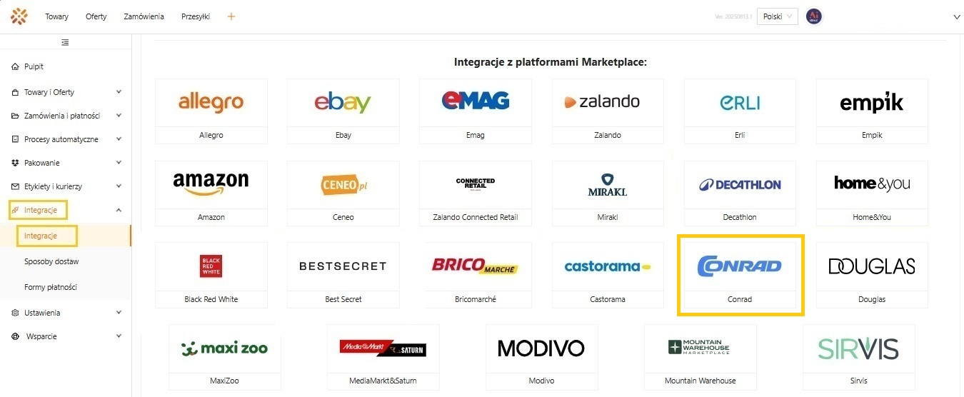 - W sekcji Integracje z platformami Marketplace należy wyszukać tej z logo i nazwą Conrad