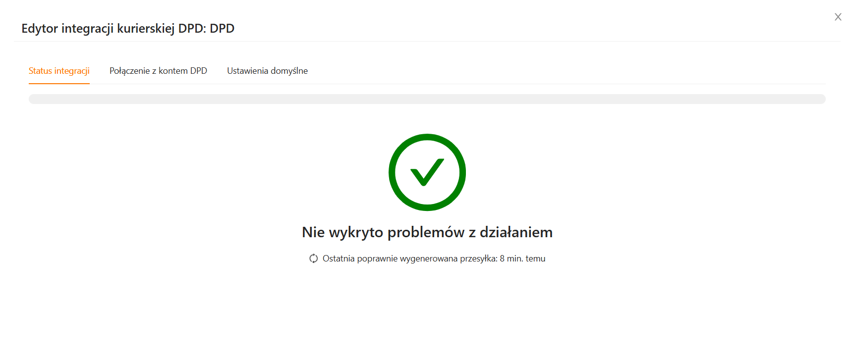 Jeśli integracja została skonfigurowana poprawnie, w jej kreatorze przez większość czasu zobaczysz komunikat Nie wykryto problemów z działaniem. Ten status oznacza, że ostatnia przesyłka nadawana wybranym kurierem została utworzona prawidłowo, a połączenie z kontem kurierskim jest poprawne.