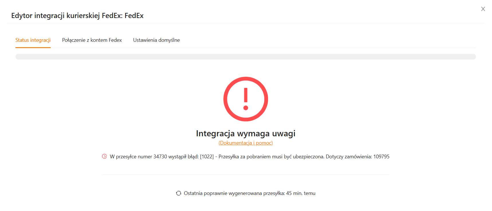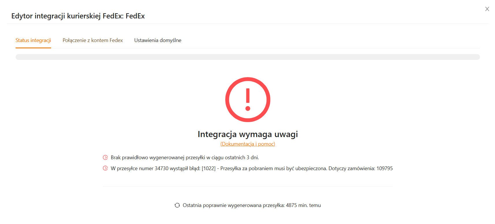 Możesz również zobaczyć kilka błędów, gdy integracja nie była używana przez dłuższy czas (dłużej niż 3 dni), a dodatkowo tworzenie ostatniej przesyłki zakończyło się niepowodzeniem (przykład poniżej).