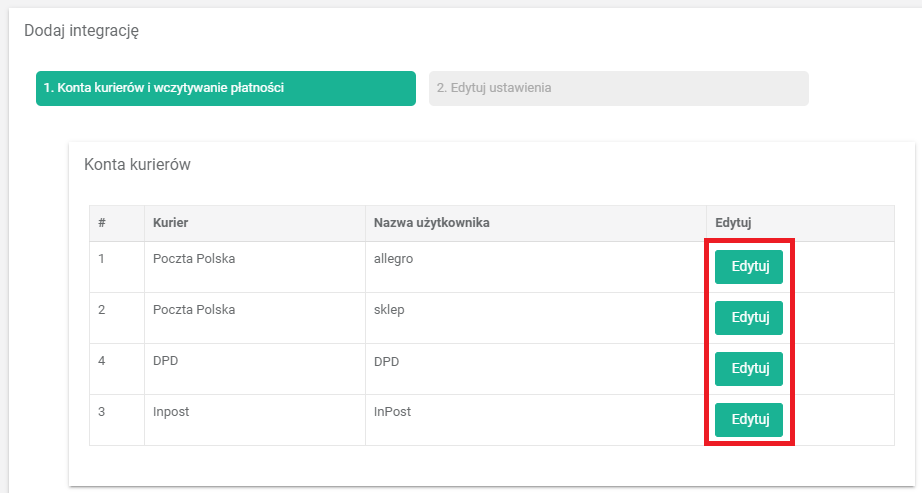 - Otworzy się instalator w którym będą widoczne dodane wcześniej konta kurierów, które można edytować.