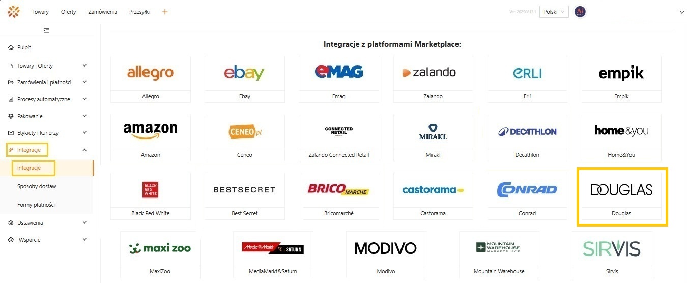 - W sekcji Integracje z platformami Marketplace należy wyszukać tej z logo i nazwą Douglas