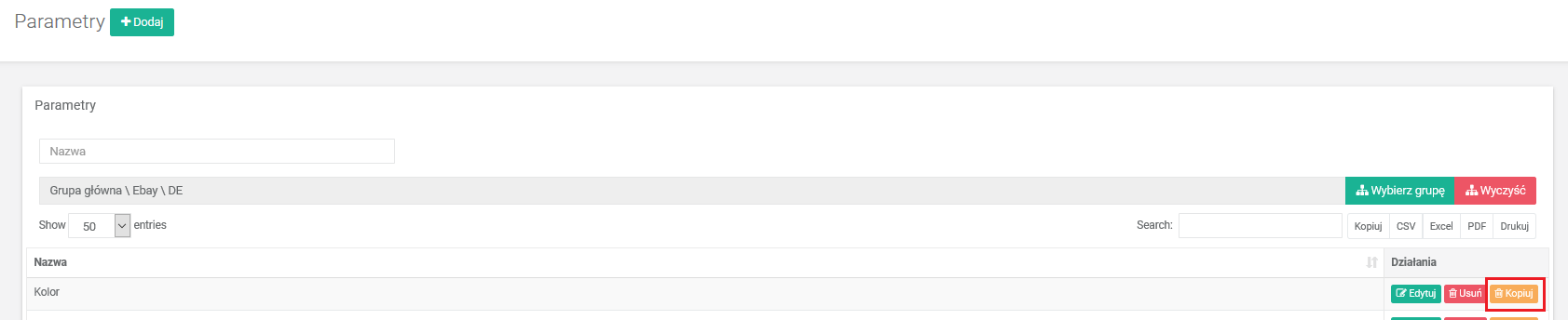 - Następnie przechodzimy do parametrów (Konfiguracja –> Parametry). W kategorii eBay w której będzie wystawiona oferta odnajdujemy parametr, który chcemy zastosować jako wielowartościowy np. Kolor i klikamy przy nim Kopiuj.