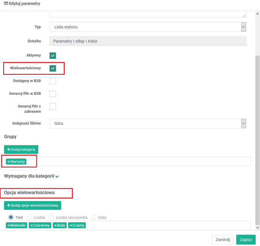 - W ten sposób przygotowany parametr będzie dostępny jako wariant i będzie można go użyć podczas tworzenia oferty wielowariantowej.