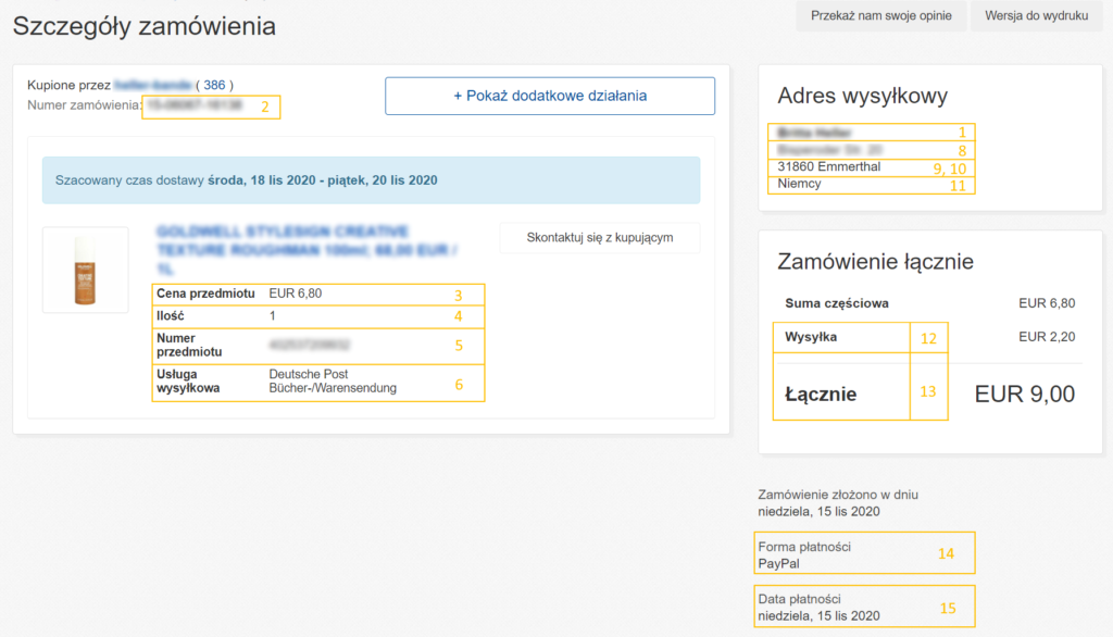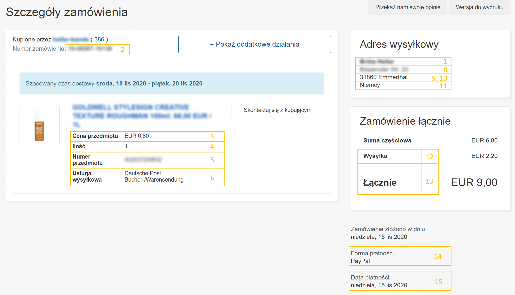 Edycja zamówienia > Formularz adresu > Kupujący Nazwa 7 Edycja Zamówienia > Szczegóły dostawy/Adres wysyłkowy Imię i Nazwisko / adres dostawy 1