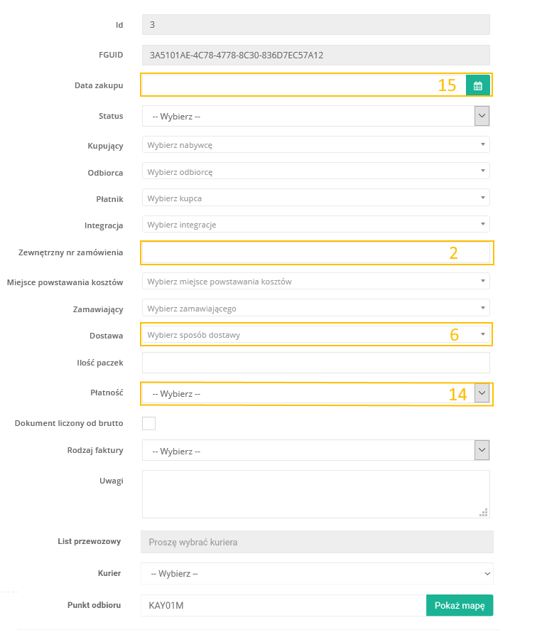 Edycja zamówienia > Formularz zamówienia Data zakupu 15 Edycja Zamówienia Zapłacone 15