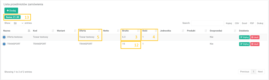 Edycja zamówienia > Lista przedmiotów zamówienia Suma 13 Edycja Zamówienia > Zamówienie łącznie Łącznie 13