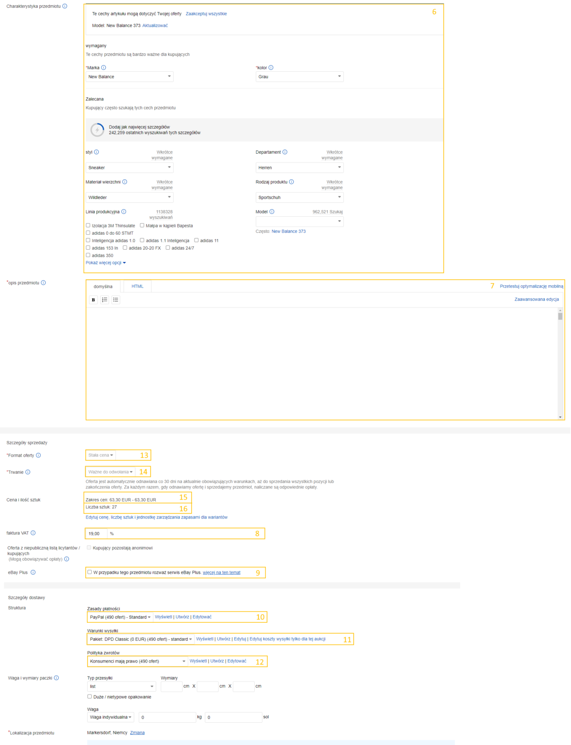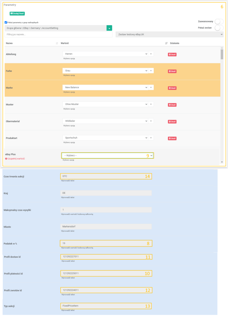 Parametry Profil zwrotów 12 Szczegóły dostawy Polityka zwrotów 12 Parametr znajduje się w Grupa główna\ EBay\Kraj\AccountSetting