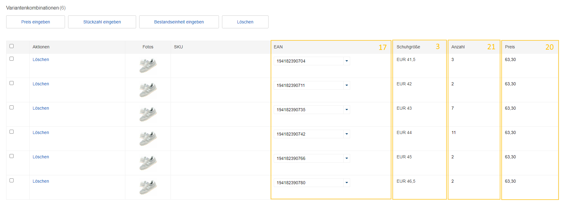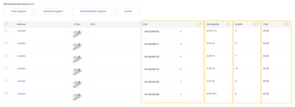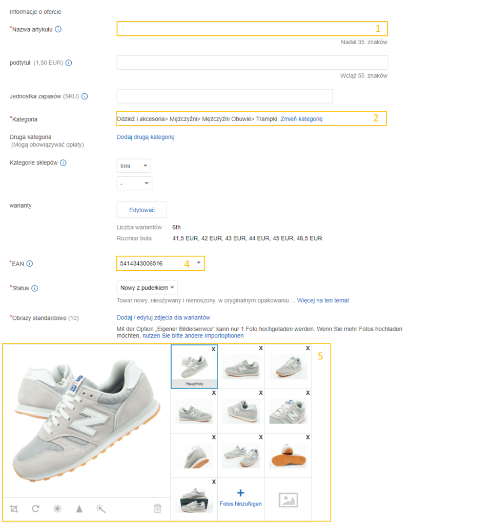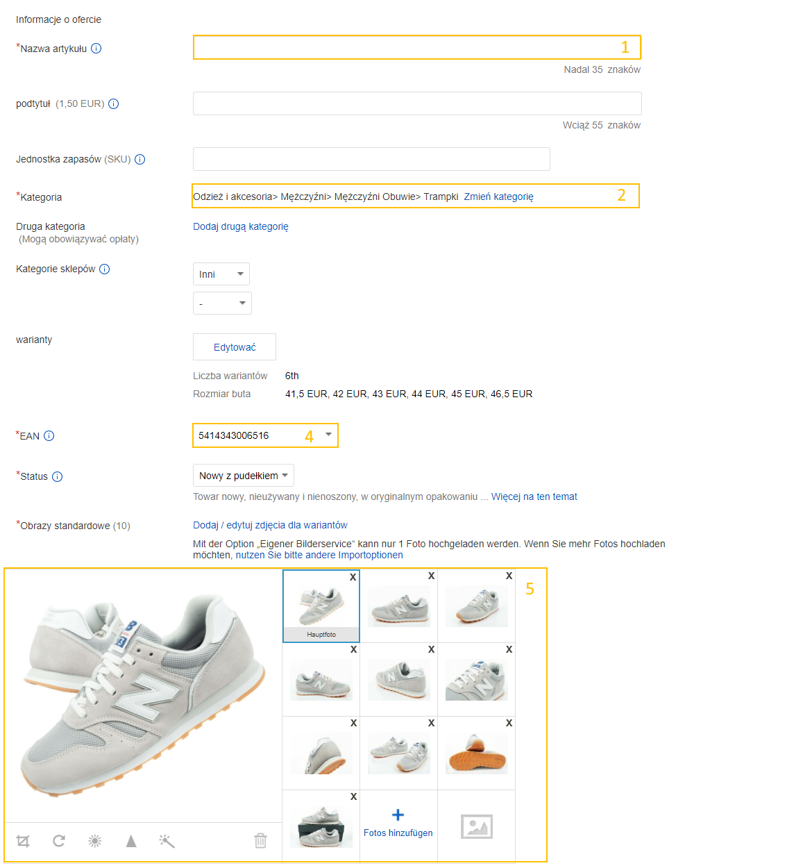 Informacje dodatkowe o ofercie; Parametry; Wariant i cena > Zestaw EAN 4 Informacje o ofercie EAN 4 Dla oferty bez wariantów. EAN może też być przekazywany z pola w zestawach. Można wtedy przypisać jeden EAN dla zestawu składającego się z kilku produktów.