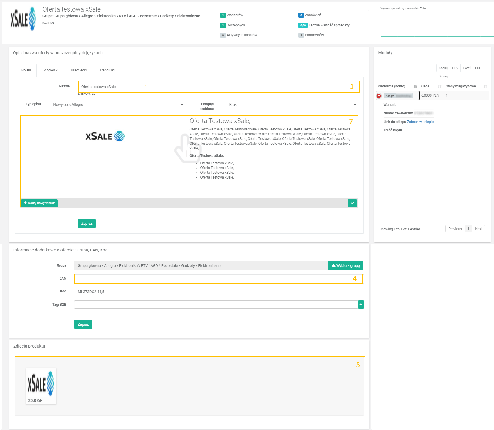 Tabela zawiera odpowiedniki pól z xSale i eBay wraz z nazwami tych pól w danych systemach oraz numer pola, którym oznaczone jest ono na zrzutach w galerii znajdujących się pod tabelą.