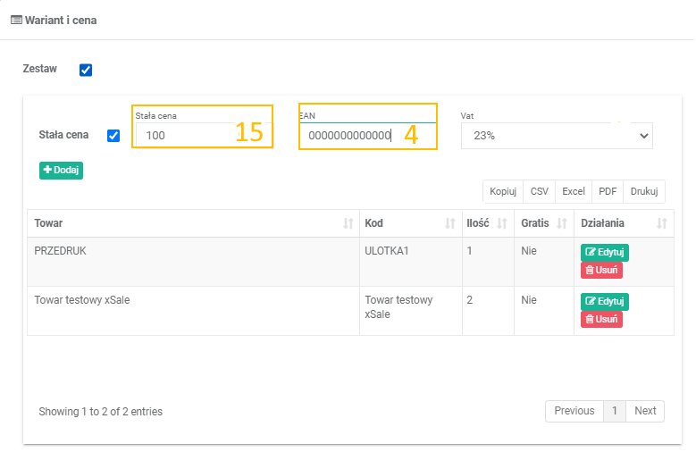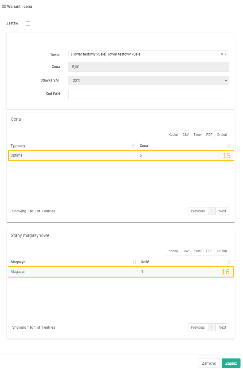 Warianty i cena > Cena; Warianty i cena > Zestaw > Cena Cena; Stała cena 15 Szczegóły sprzedaży Cena 15 Dla oferty bez wariantów. Cena może też być przekazywana z pola „Stała cena” w przypadku zestawu.