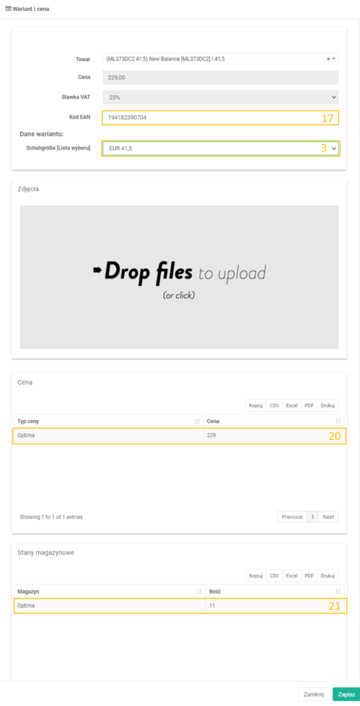 Warianty i cena > Stany magazynowe Ilość 21 Szczegóły sprzedaży > Warianty Ilość 21 Dla oferty wielowariantowej
