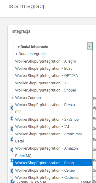 Na liście integracji klikamy przycisk +Dodaj integrację i z listy wybieramy integrację z Emag.