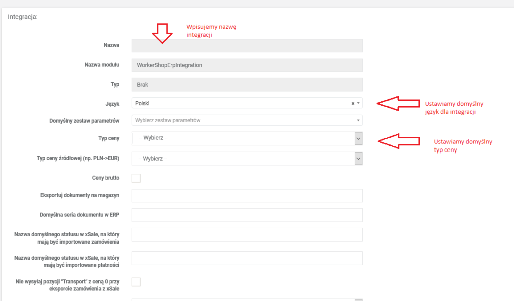 Następnie uzupełniamy formularz ustawiając domyślny język dla integracji dalej ustawiamy typ ceny.