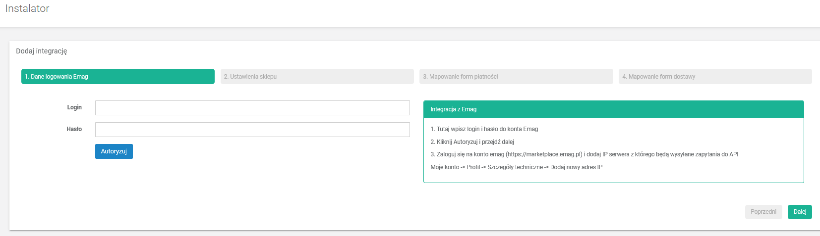 Po uzupełnieniu formularza klikamy Zapisz i przejdź do instalatora aby przejść do dalszych kroków kreatora integracji.
