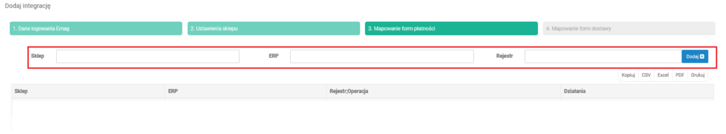 Ustalamy mapowanie płatności dodając odpowiednie formy płatności po stronie Emag i systemu ERP. W polu Sklep dodajemy formę płatności w Emag. W polu ERP dodajemy formę płatności w ERP. Jeżeli płatności mają zostać wczytane na rejestr kasowo-bankowy, to uzupełniamy również pole Rejestr w formacie rejestr/typ operacji np. KASA/KP.