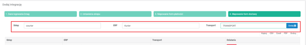 W polu Sklep wpisujemy sposób dostawy z Emag np. courier, a w polu ERP podajemy na jaki sposób dostawy ma zostać wczytany do ERP np. kurier. W polu Transport podajemy kod usługi na jaki chcemy wczytać koszt wysłania towaru np. TRANSPORT.