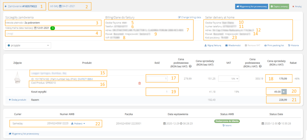Edycja zamówienia > Formularz adresu > Odbiorca Telefon 11 Seller delivery at home Numer telefonu 11