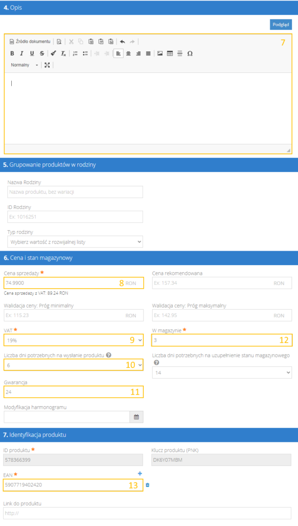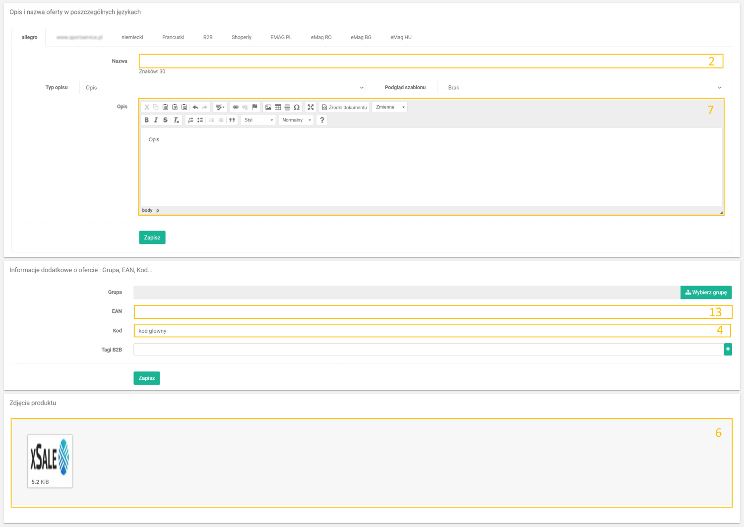 Opis i nazwa oferty w poszczególnych językach Opis 7 4. Opis Opis 7 Tylko dla nowo zakładanych ofert. Treści oferty nie można edytować gdy produkt już istnieje w eMag.
